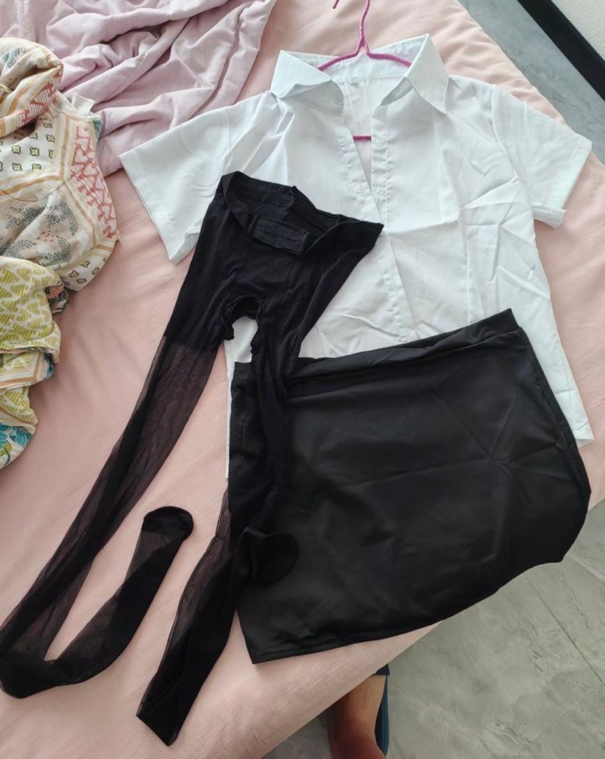 周五晚上孩子睡了后,我迫不及待把老婆扒光了,给她穿上开档丝袜,白衬衣,包臀裙,虽然开档丝袜有点不得劲,但总体还好,能穿上而且效果还不错。穿上以后我就迫不及待想拍照,但是老婆不让我拍,不想破坏气氛,只好作罢。